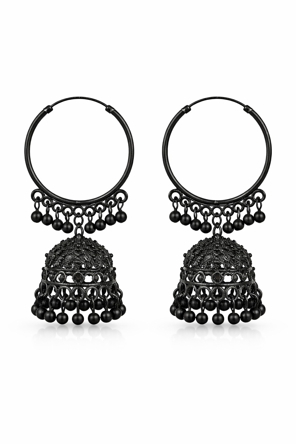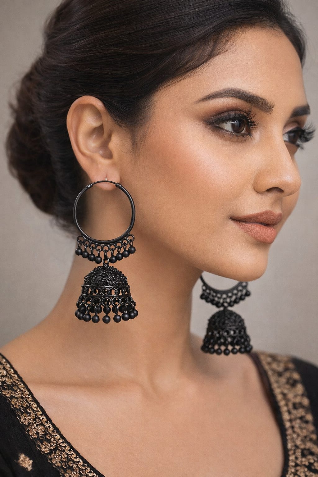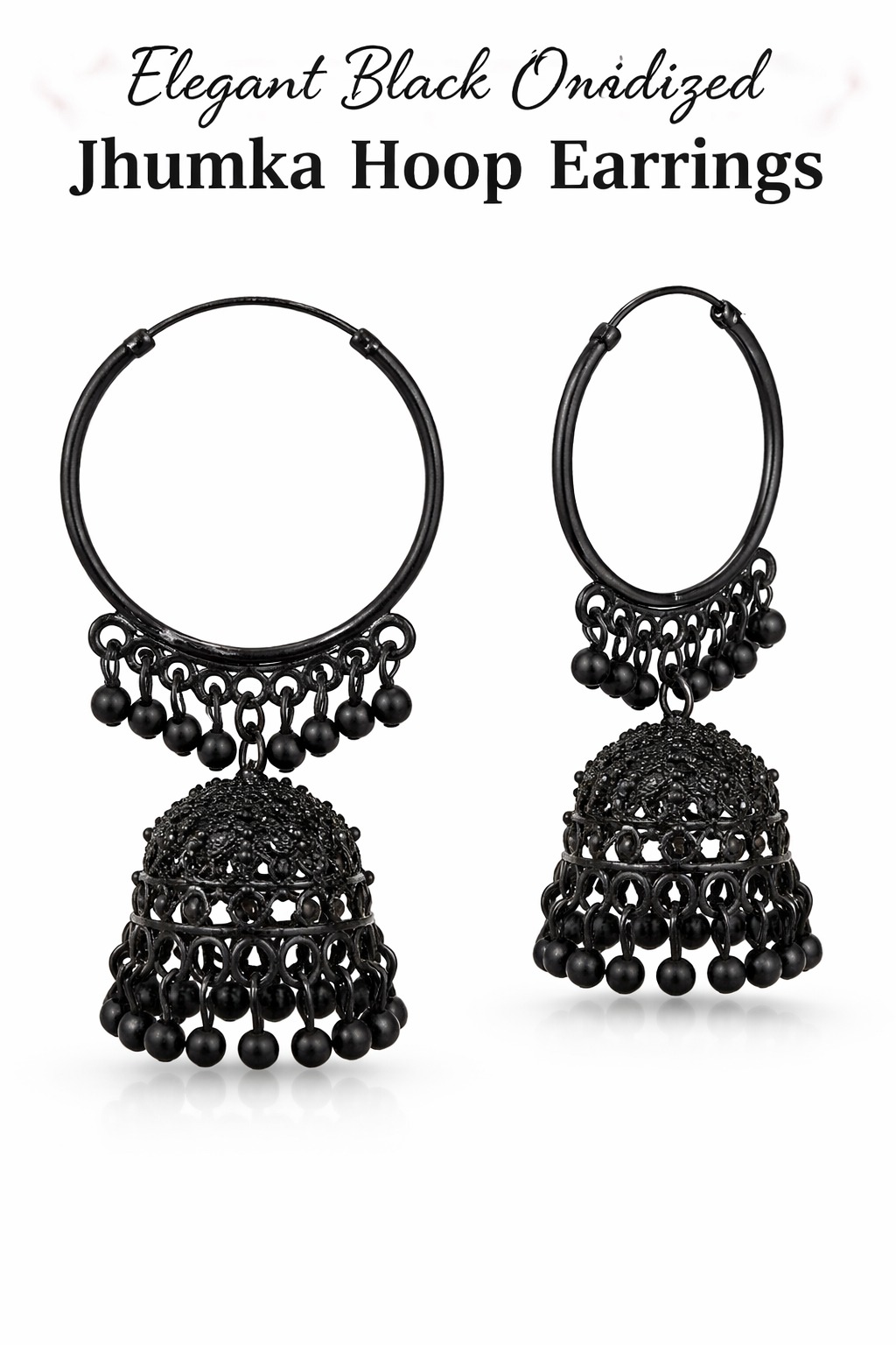 Add a touch of elegance to your ethnic look with these beautiful Black Oxidized Jhumka Hoop Earrings. Designed with a stylish hoop and detailed jhumka hanging, these earrings give a perfect traditional yet modern look.