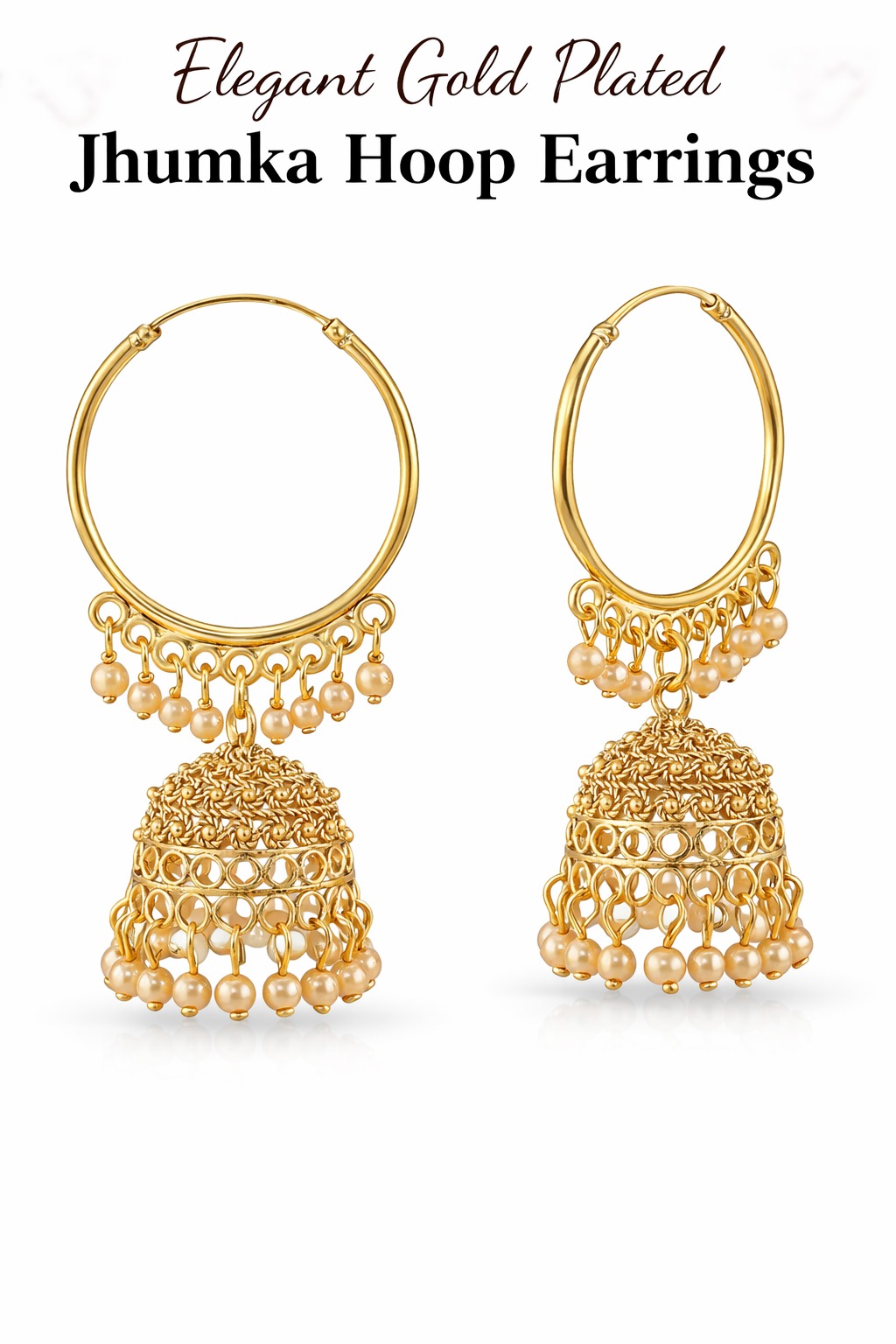 Add timeless elegance to your jewellery collection with these stunning gold plated jhumka hoop earrings. Crafted with a traditional jhumki design and delicate pearl drop detailing, these earrings bring a perfect blend of classic Indian style and modern fashion.