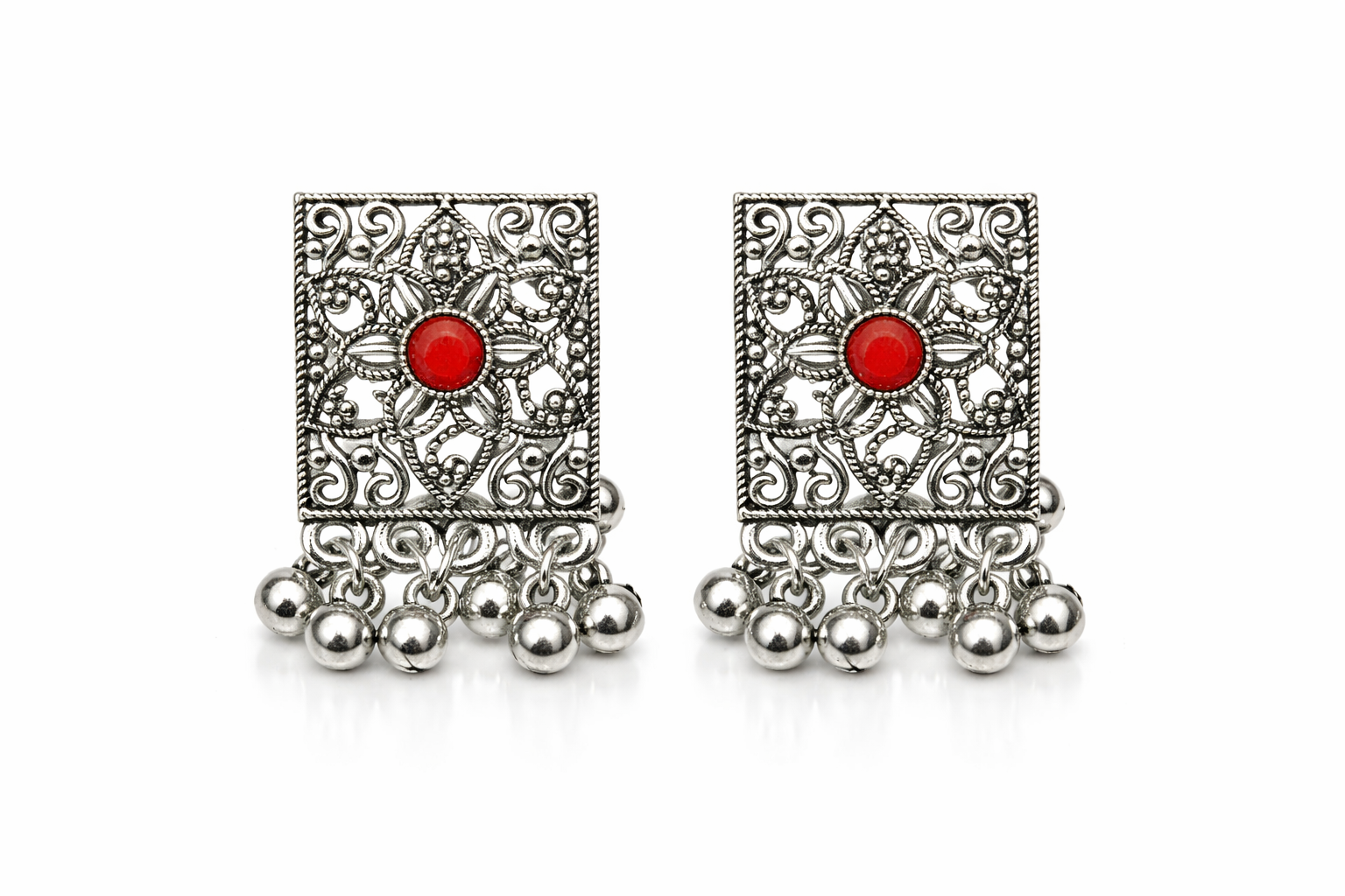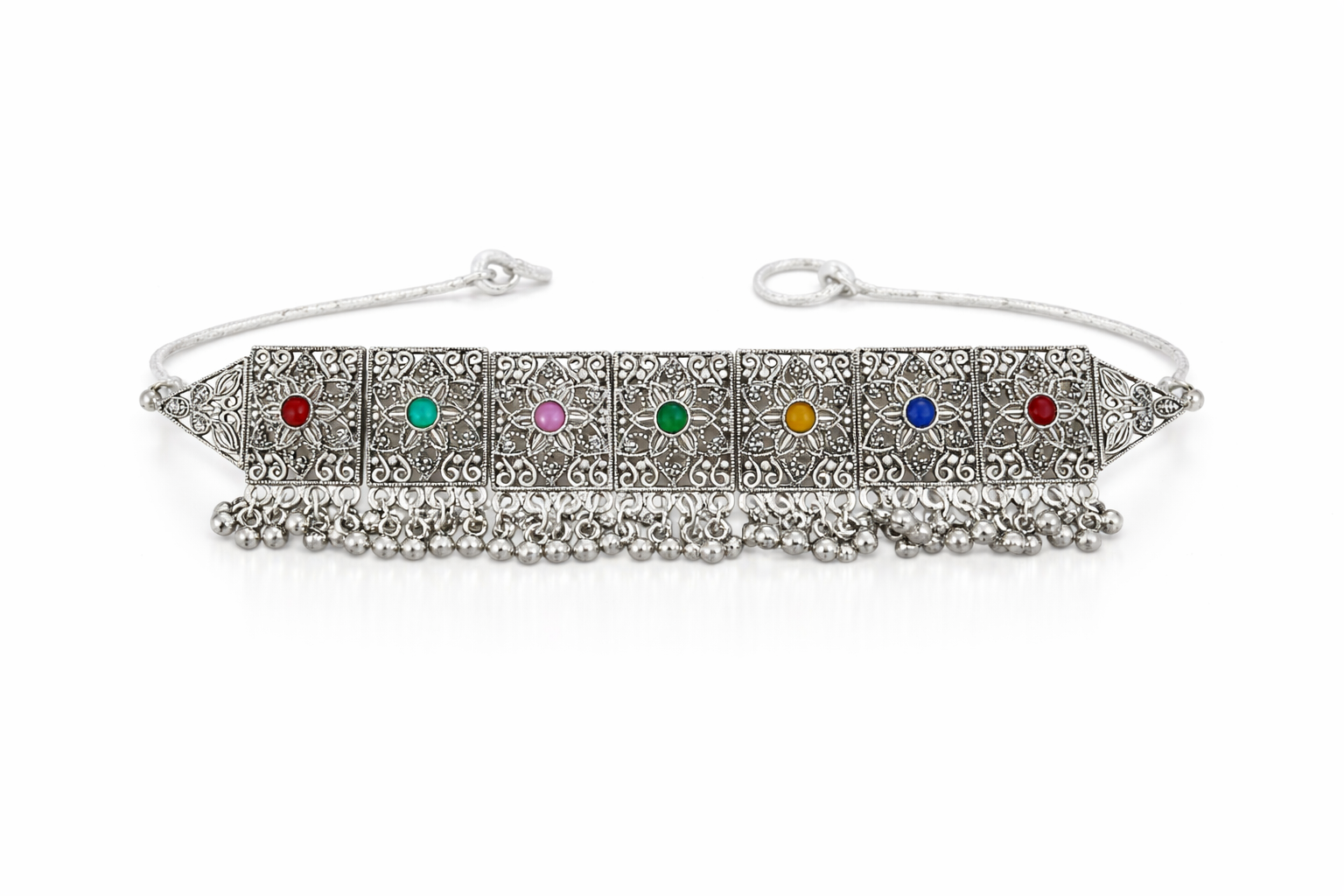 Bring out your ethnic charm with this beautifully designed oxidised silver plated bracelet and earring set. Decorated with multicolour stones and intricate patterns, this set is perfect for traditional outfits, festive occasions, and casual ethnic looks.