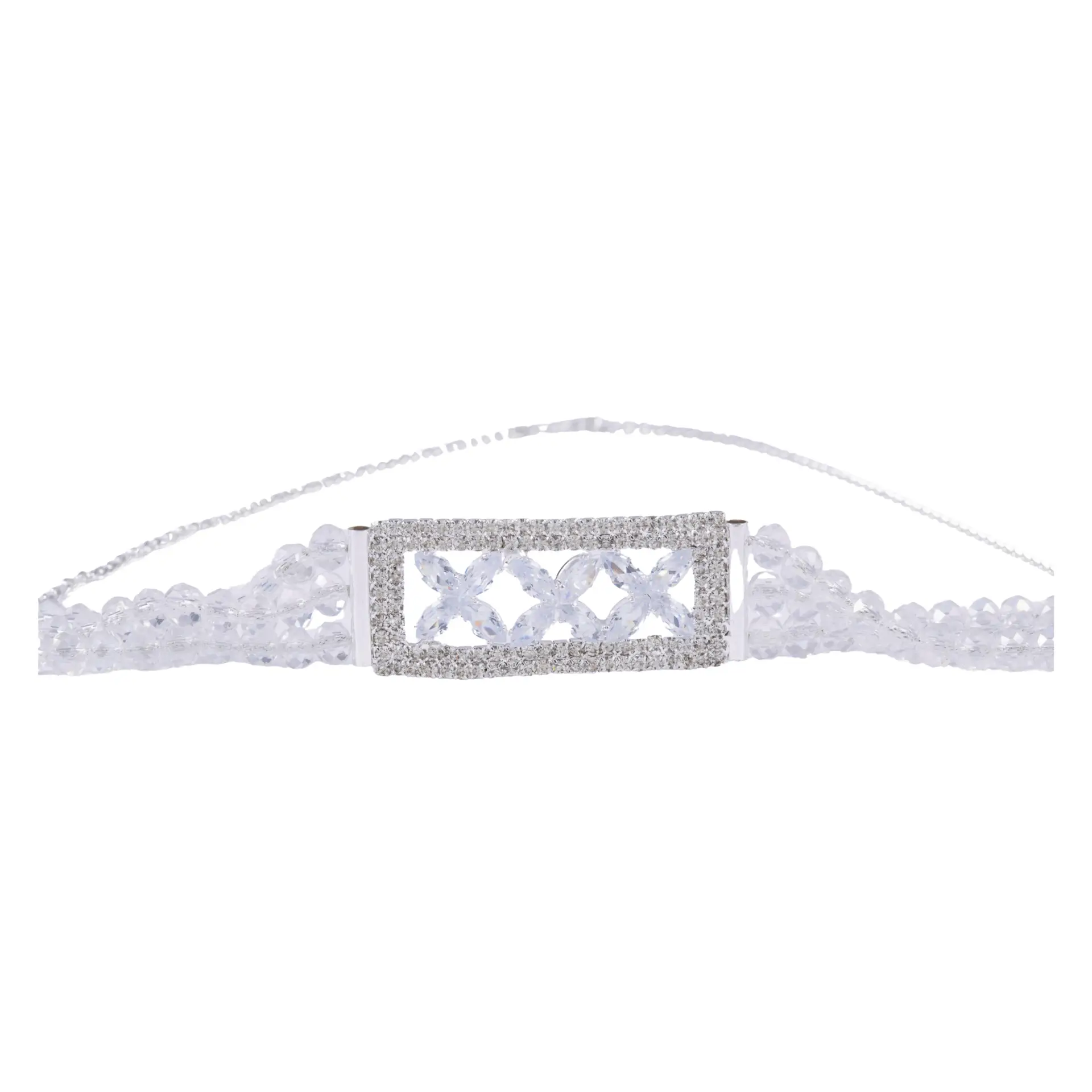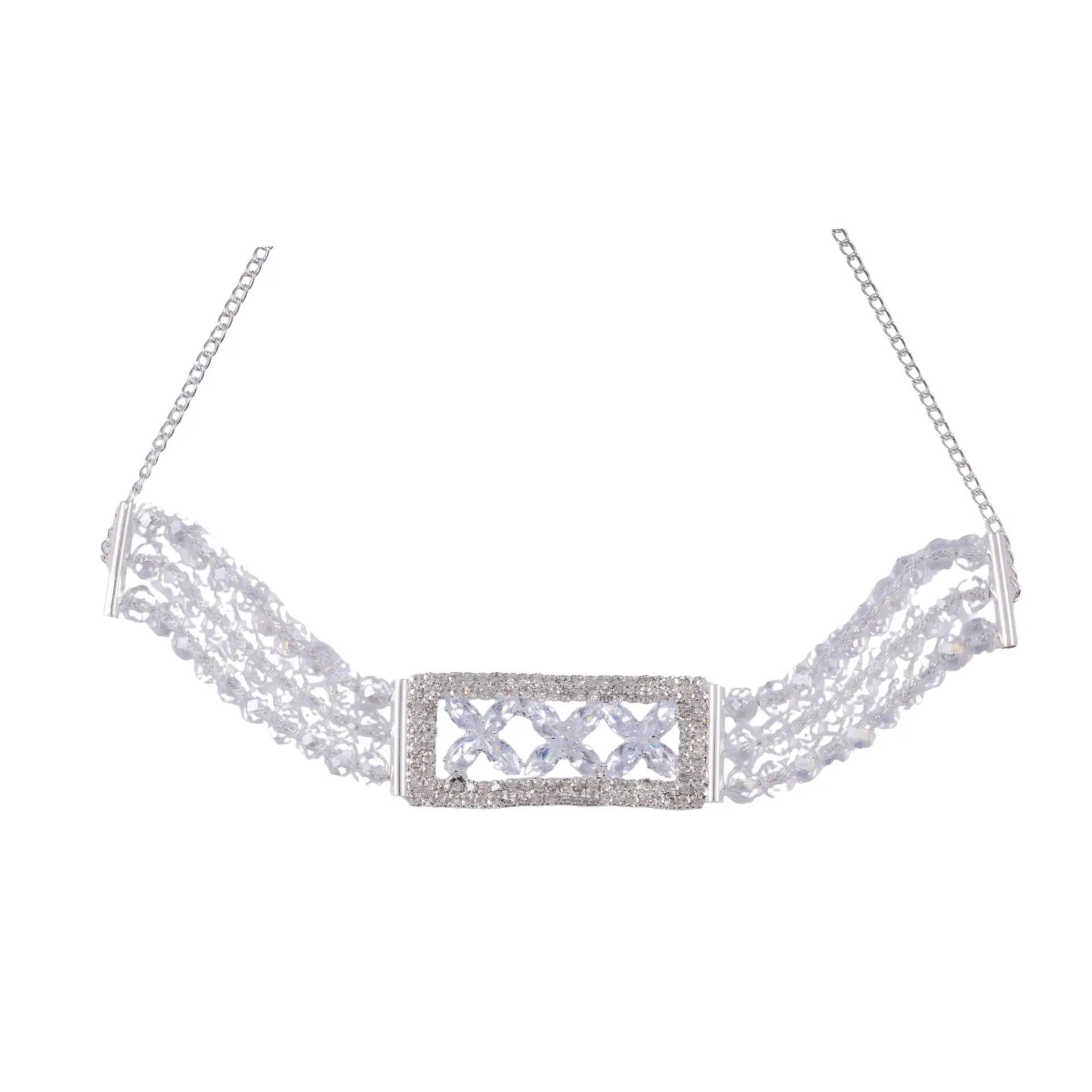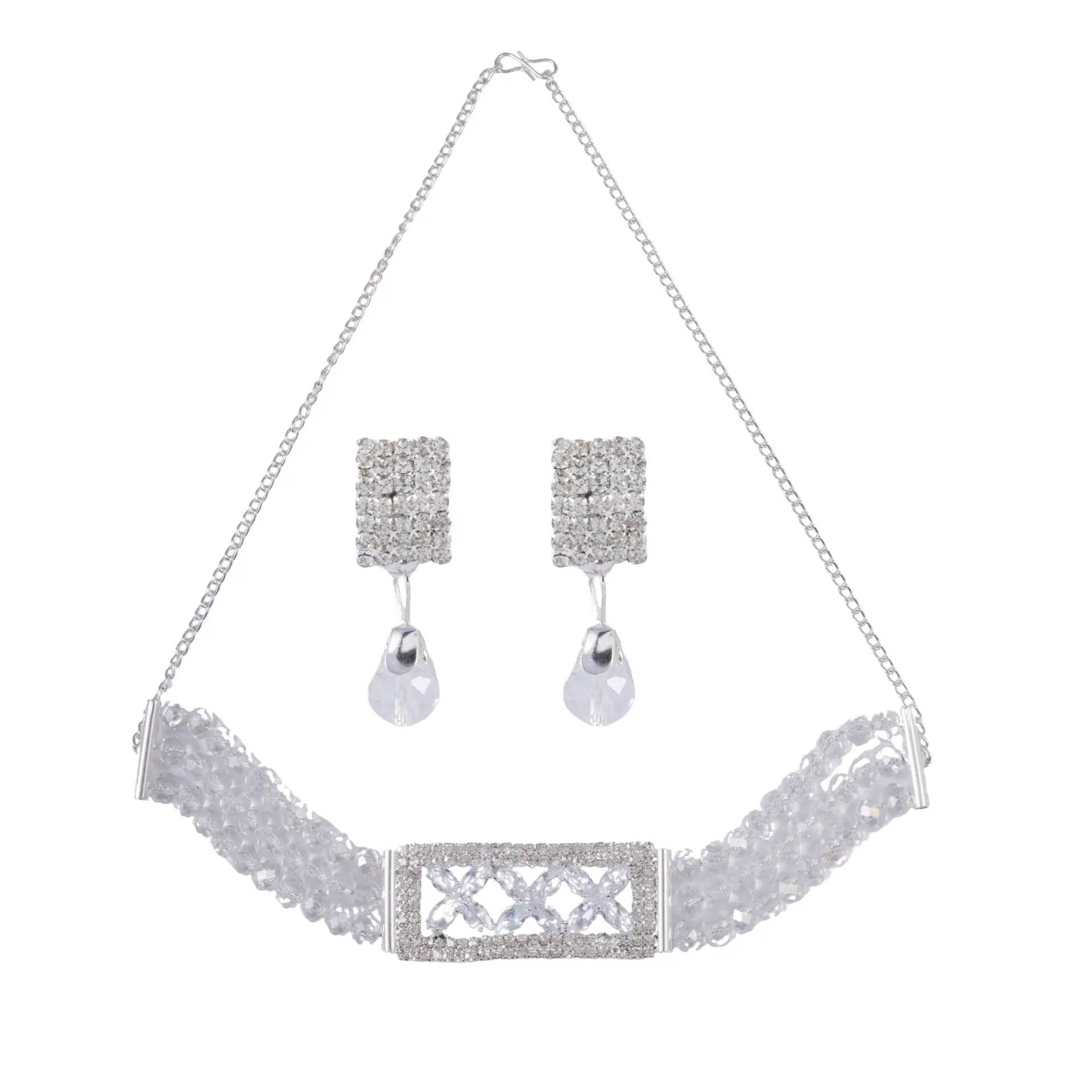 Make every occasion special with this elegant silver crystal beaded choker set. The sparkling beaded choker is paired with dazzling rectangular stone-studded earrings featuring teardrop crystal danglers. Lightweight, stylish, and affordable – this set is perfect for parties, weddings, and festive celebrations.