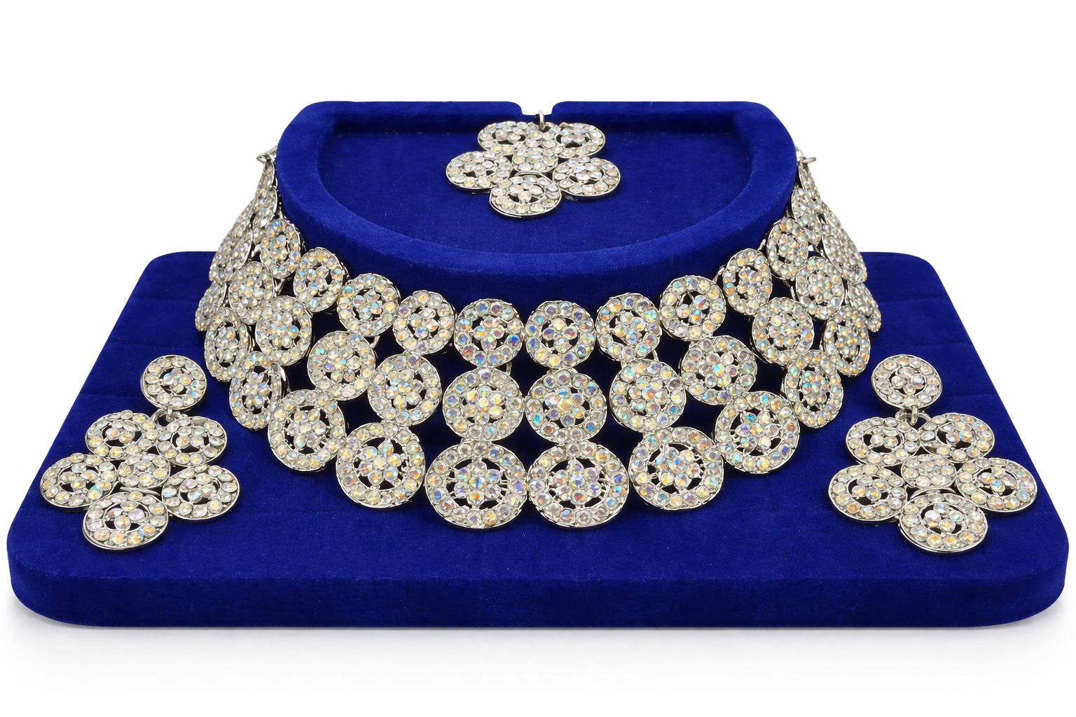 Shine bright with this stunning crystal-studded choker set. Designed with shimmering stones in a floral pattern, this set includes a stylish choker necklace, matching earrings, and a maang tikka. Perfect for weddings, parties, and festive occasions. Lightweight yet eye-catching, it adds instant glamour to any outfit.